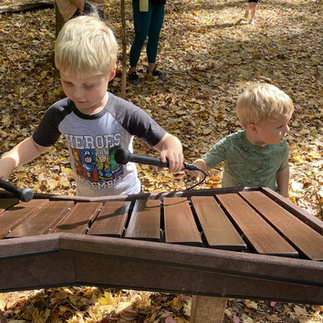 Sunshine Slope was our next stop where the boys climbed inside suspended canvas pods to relax and laugh together. Music Circle contains wood and metal instruments where people are free to create their own musical masterpieces. A little further up the trail is Reflection Knoll, containing a circle of large rocks to climb, stand, or sit on and enjoy the serenity of the woods around you. It was here where Hudson climbed up on the tallest rock that he could, raising his arms to the sky while exclaiming "I AM THE KING OF THE WORLD!"
